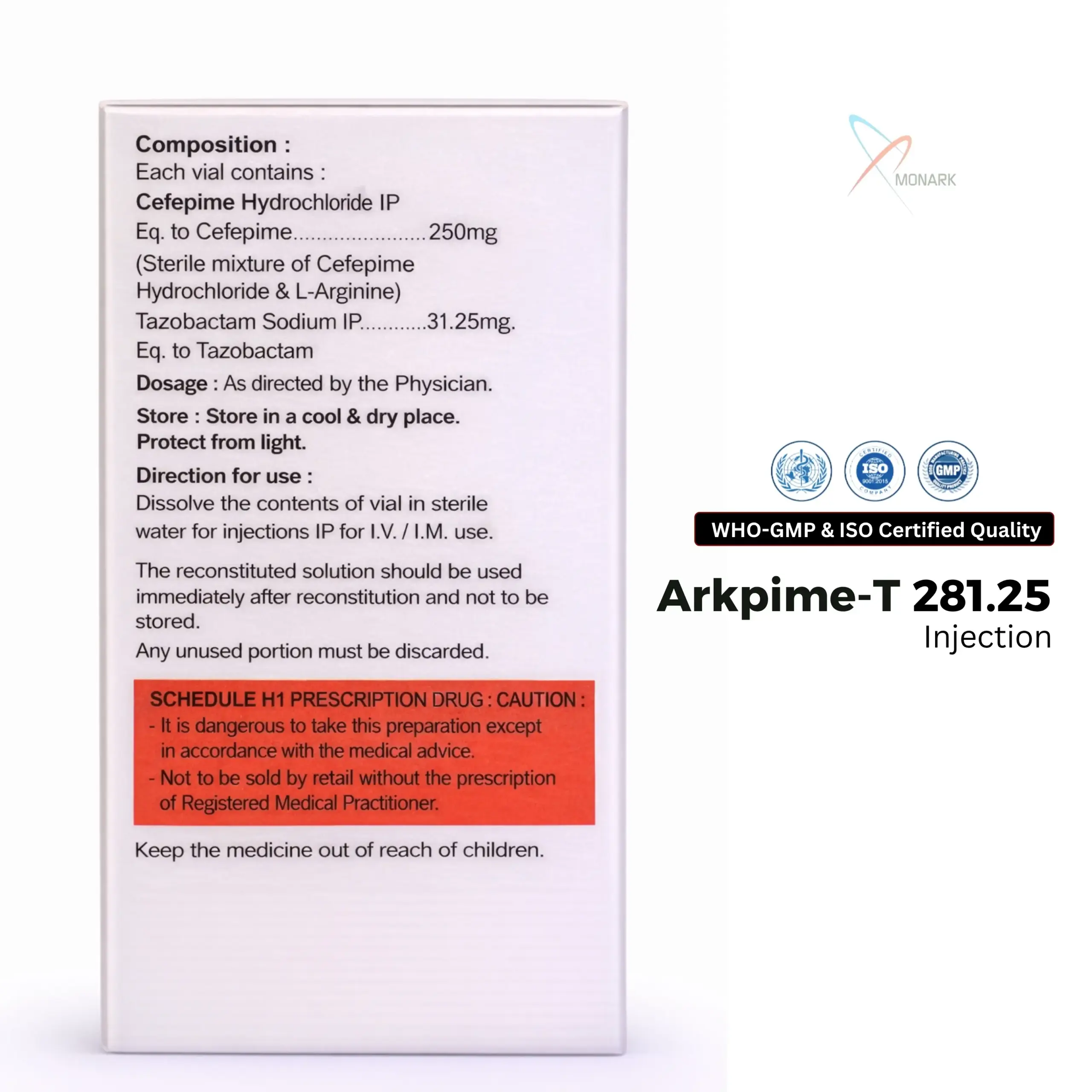 Arkpime-T 281.25 is a highly effective antibiotic injection formulated with a powerful combination of Cefepime Hydrochloride 250mg and Tazobactam Sodium 31.25mg. Designed to combat severe bacterial infections, this formulation is widely trusted in hospitals and clinical settings. Available in a convenient vial packaging (281.25 mg), it ensures precise dosage and efficient administration.