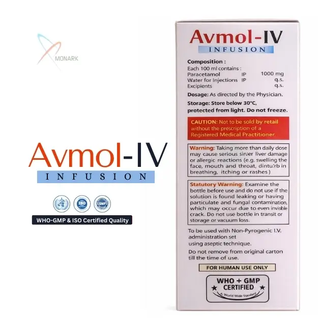 Avmol-IV Infusion is a trusted intravenous formulation containing Paracetamol 1000mg (1.0% w/v), designed for rapid relief from pain and fever in clinical settings. This paracetamol IV infusion is widely used in hospitals when oral administration is not feasible, ensuring a quick onset of action and consistent therapeutic effects.