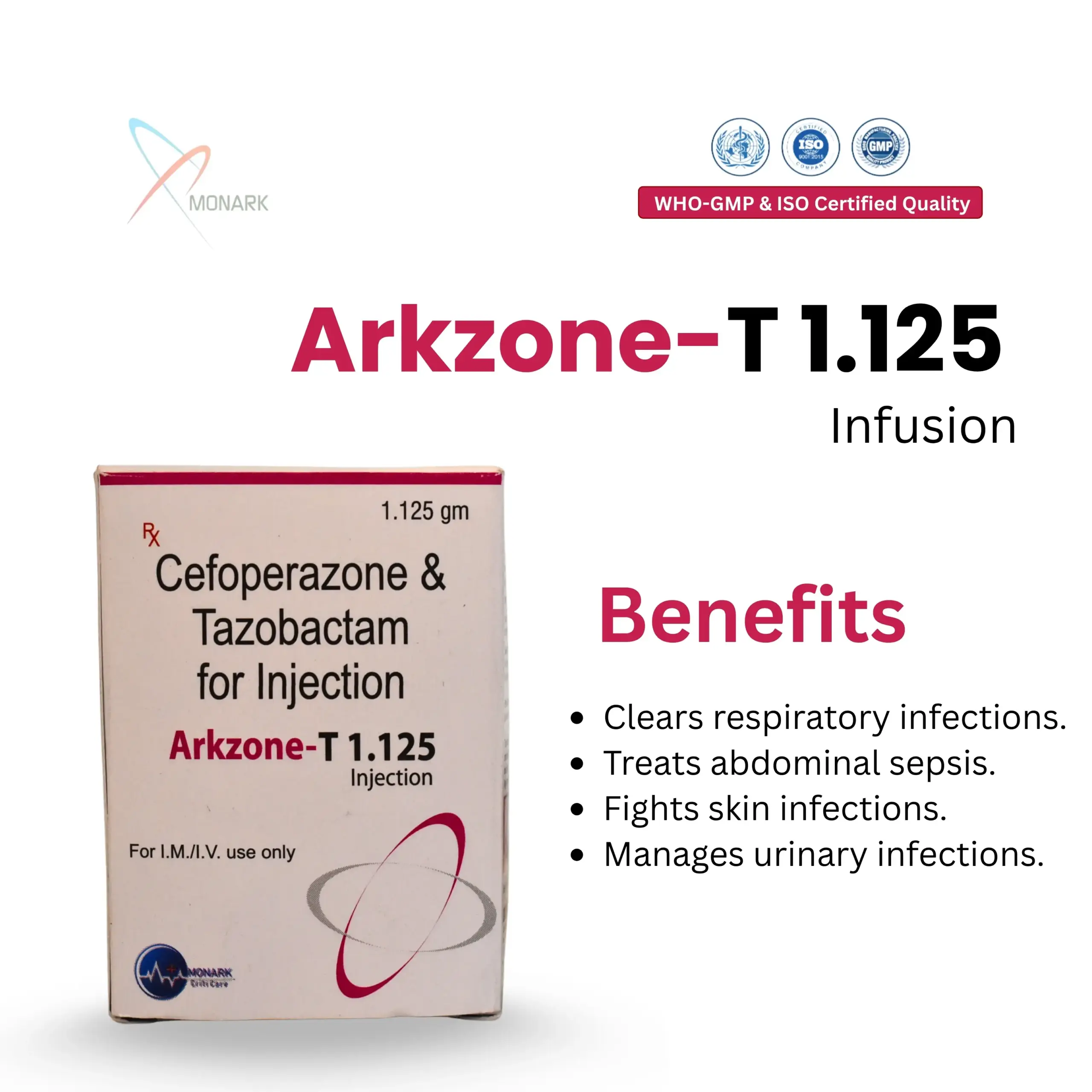 Arkzone-T 1.125 is a powerful Cefoperazone + Tazobactam Injection, formulated to treat a wide range of serious bacterial infections. This combination includes Cefoperazone and Tazobactam, working together to deliver an effective broad-spectrum antibiotic injection for clinical use.