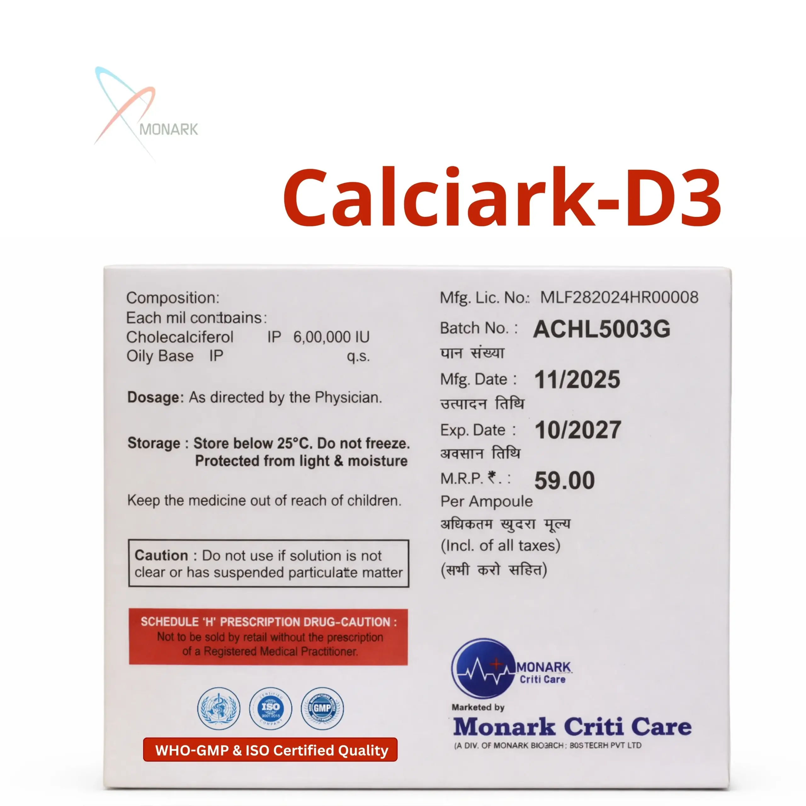 Calciark D3 Injection contains Cholecalciferol Injection BP 600000 IU/2 ml, a powerful form of Vitamin D3 used to treat and prevent Vitamin D deficiency. It plays a crucial role in improving calcium absorption, strengthening bones, and supporting overall health.