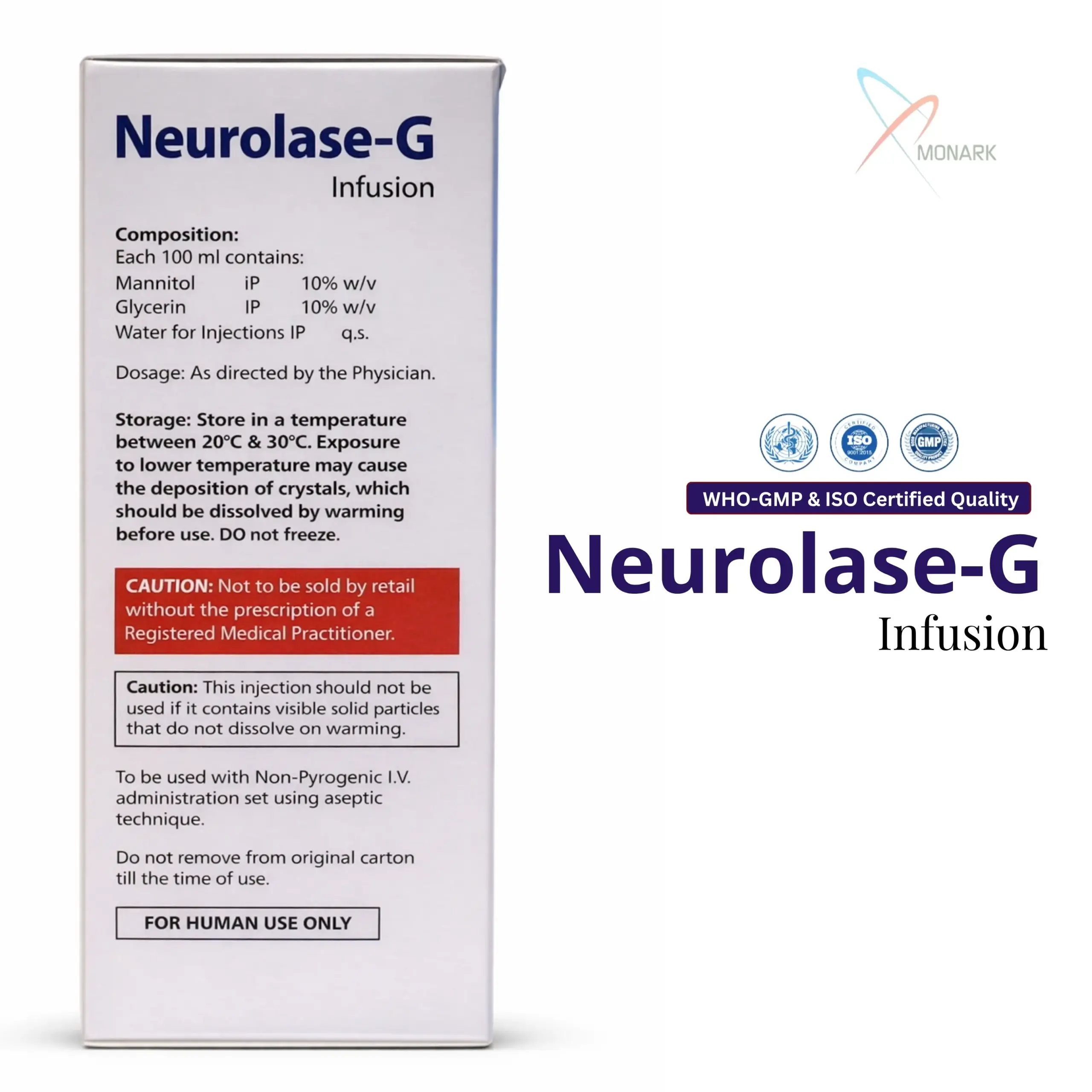 Neurolase-G is a clinically formulated infusion combining Mannitol IP 10% w/v and Glycerin IP 10% w/v in sterile Water for Injection. This dual-action composition is widely used in medical settings for its powerful osmotic properties, helping manage fluid balance and reduce elevated intracranial and intraocular pressure.